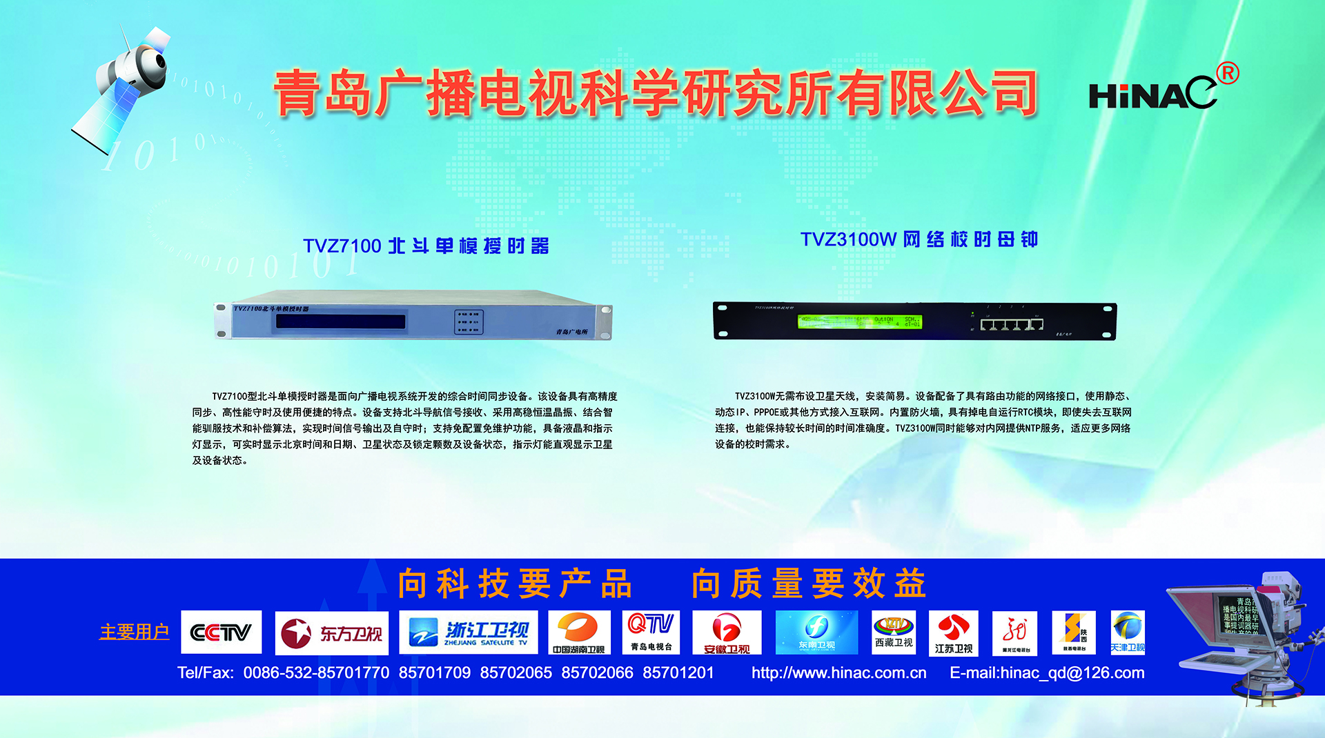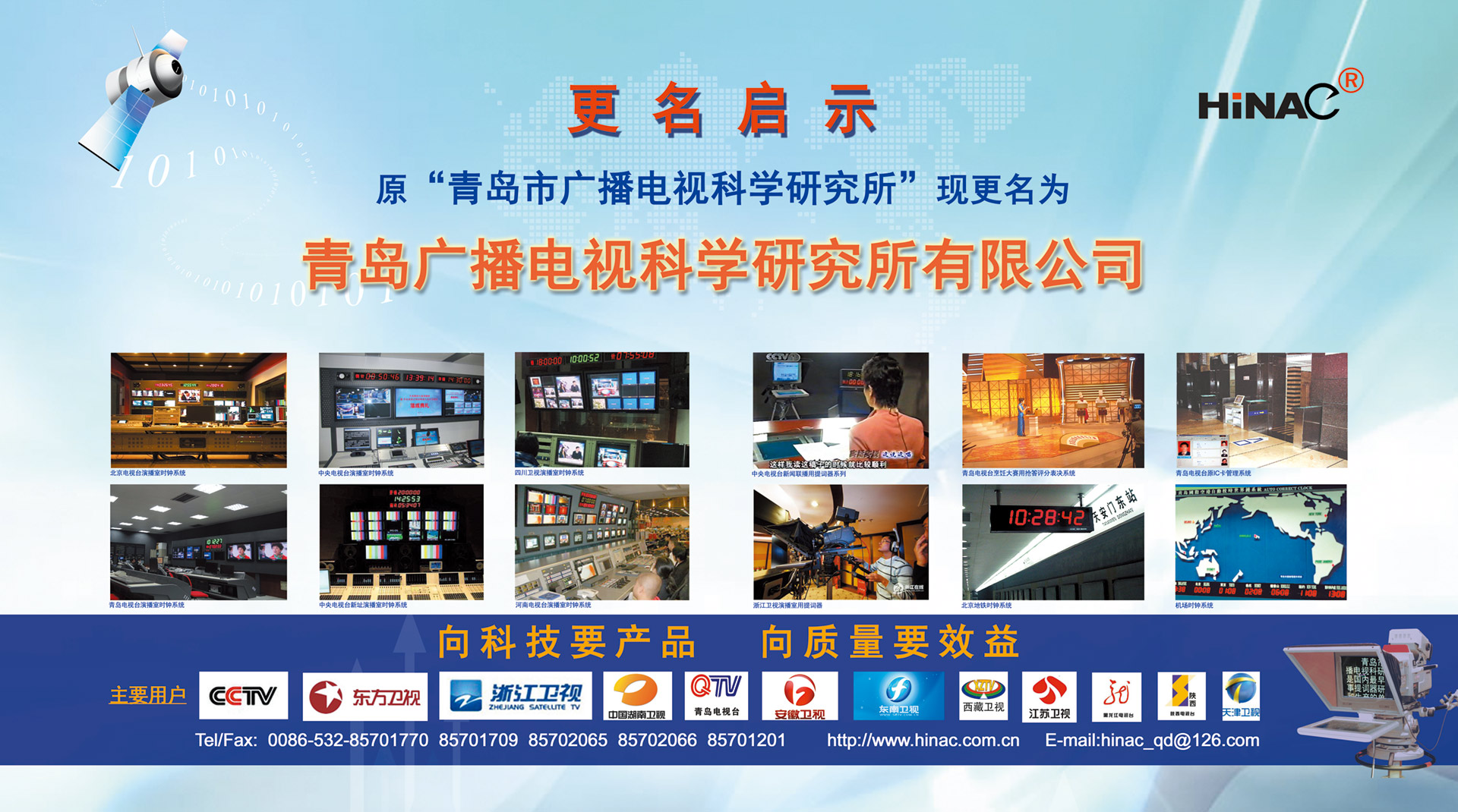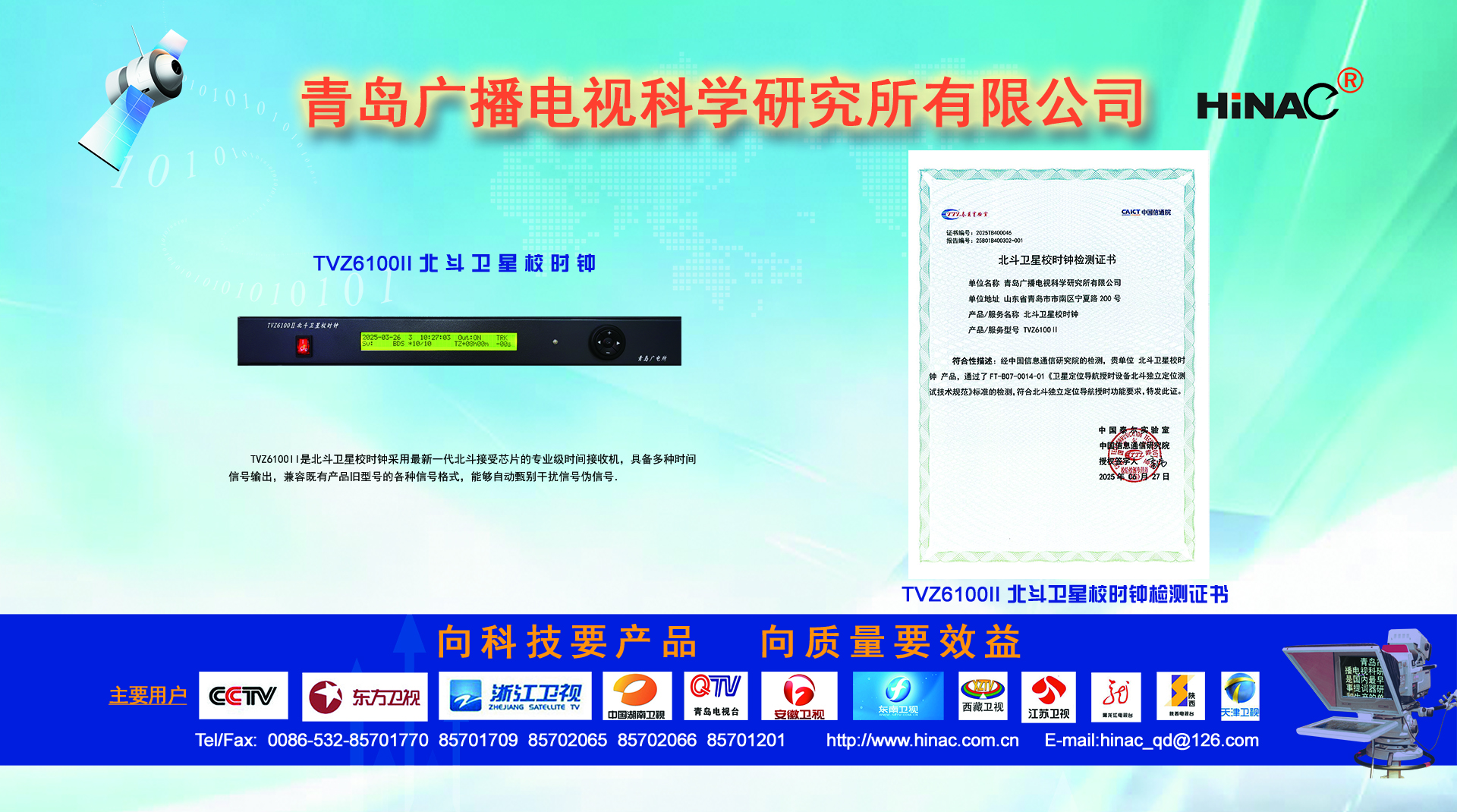 25年不悔的執(zhí)著追求! 25年不懈的專(zhuān)業(yè)堅(jiān)持! 青島廣播電視科學(xué)研究所有限公司(簡(jiǎn)稱(chēng)青島廣電所)以其對(duì)廣電科技事業(yè)無(wú)限的熱愛(ài),以及為爭(zhēng)做中國(guó)最優(yōu)秀廣電產(chǎn)品供應(yīng)商的美好理想,25年如一日,深耕廣電設(shè)備這塊沃土,已經(jīng)形成且被市場(chǎng)高度認(rèn)可的成果有: TVZ系列GPS/北斗自動(dòng)校時(shí)鐘系統(tǒng) TC系列電視播音提詞器及電視直播系統(tǒng)整體解決方案 TL系列泰麗訊源指示系統(tǒng) QD系列搶答表決評(píng)分系統(tǒng) IC系列廣電一卡通管理系統(tǒng) 同時(shí)向:廣電設(shè)備集成商、地鐵輕軌信號(hào)系統(tǒng)設(shè)備供應(yīng)商及其它業(yè)務(wù)方向創(chuàng)新、拓展、前行! 青島廣電所在國(guó)家廣電傳媒事業(yè)不斷發(fā)展的今天,愿意和您攜手并進(jìn),為我們共同的事業(yè)發(fā)展添磚加瓦開(kāi)拓創(chuàng)新。愿意和您一道,把工作中的一個(gè)奇思妙想轉(zhuǎn)變?yōu)橐豁?xiàng)偉...